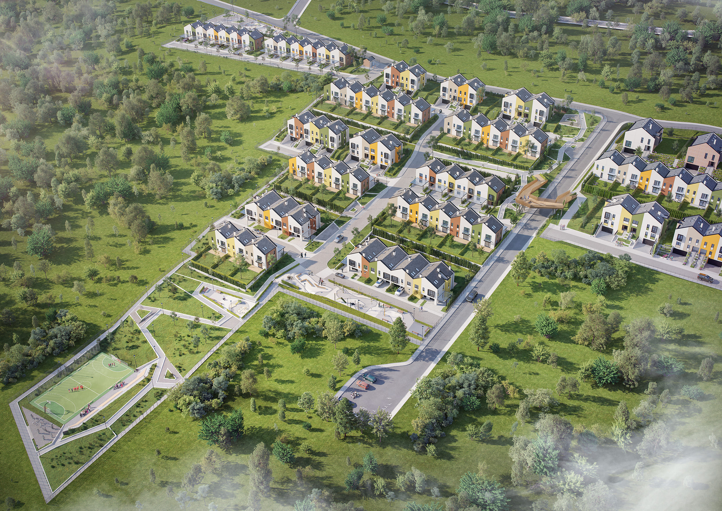 Construction of Phase 1 began in the summer of 2019 and includes 136 residential units comprising terraced houses, single-family houses, and semi-detached houses with various sizes and layouts. In addition to Phase 1, the construction of another 21 terraced and 6 semi-detached houses is planned. Phase 2 started at the beginning of 2021 and will expand the complex with an additional 41 terraced and 18 semi-detached houses.